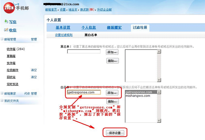 4、在邮箱的白名单中添加"mishangwo.com和getresponse.com"(不要忘记保存设置);