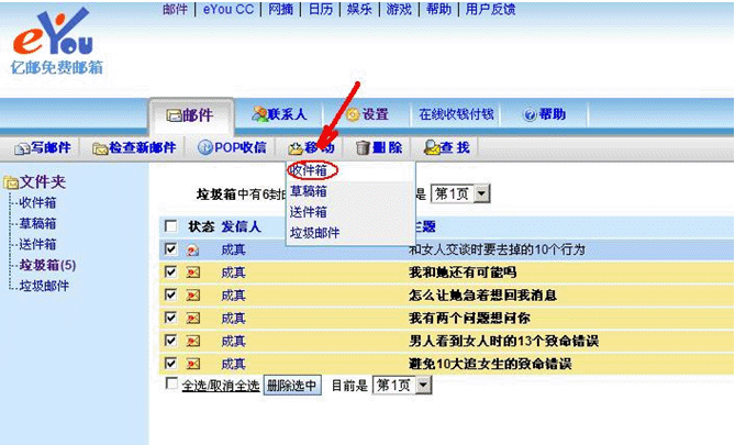 1、1)进入垃圾箱,2)选中“成真”邮件,3)点击“移动”选择“收件箱”;