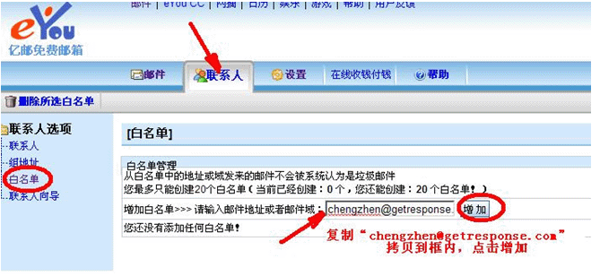 4、1)点击上方联系人,2)点击“白名单”,3)在箭头所指的框内输入"@mishangwo.com和mishangwo.net 和chengzhen@getresponse.com"(别忘记按“增加”);