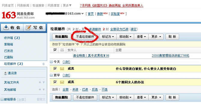 1、点击“垃圾邮件”,选中“成真”邮件,点击不是垃圾邮件;