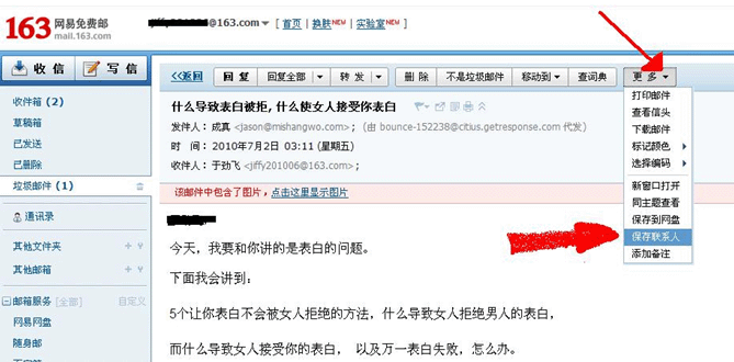 2、打开“成真”邮件,点击更多,选择保存联系人;
