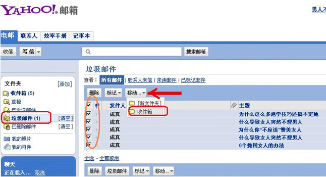 1、1)点击“垃圾邮件”,2)选中“成真”邮件,3)点击“移动”,点击“收件箱”;