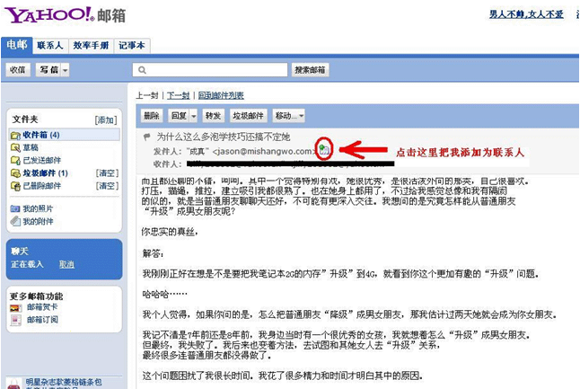 2、1)在“收件箱”中打开“成真”邮件,2)点击箭头所指位置,将成真添加为联系人;